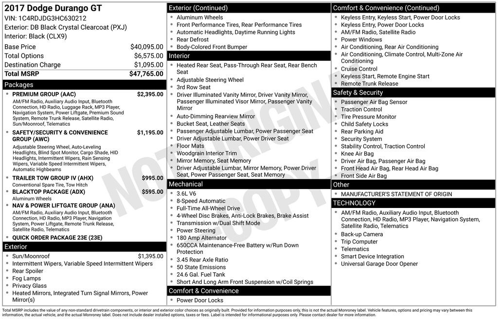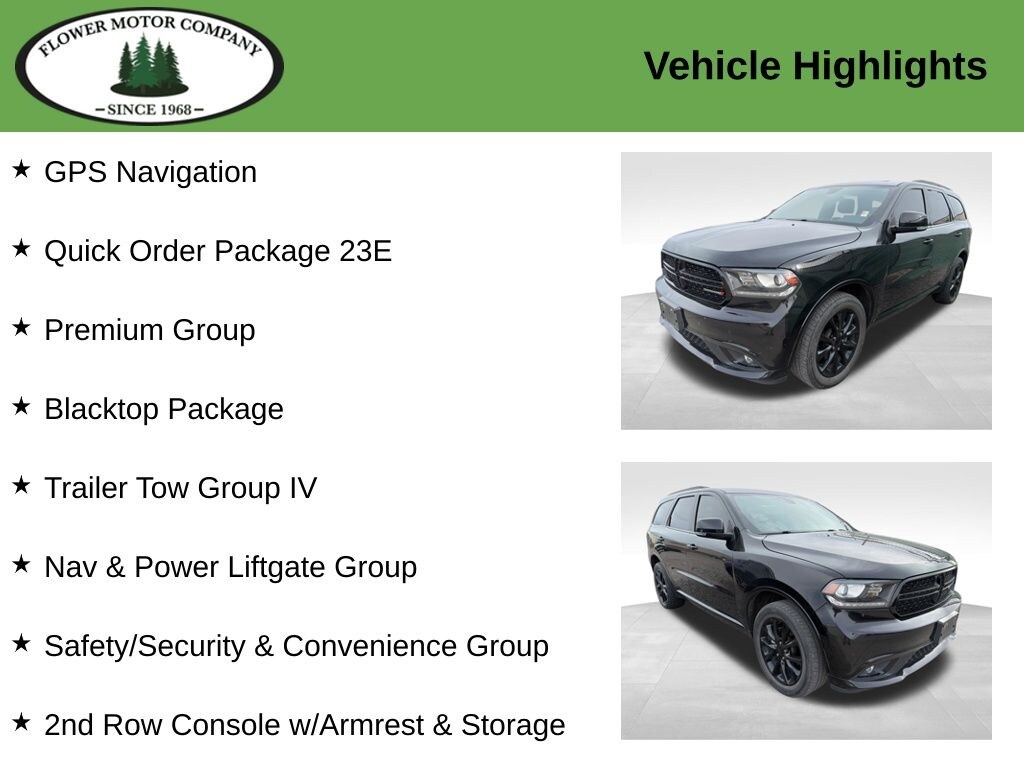 The Blacktop Package enhances the Durango's bold styling with gloss black exterior accents, including the badging, wheels, and mirrors. The Premium Group adds premium features like the power sunroof, premium audio system, and navigation. The Trailer Tow Group IV equips this Durango with heavy-duty towing capabilities, making it an excellent choice for those with active lifestyles who need to haul their toys.