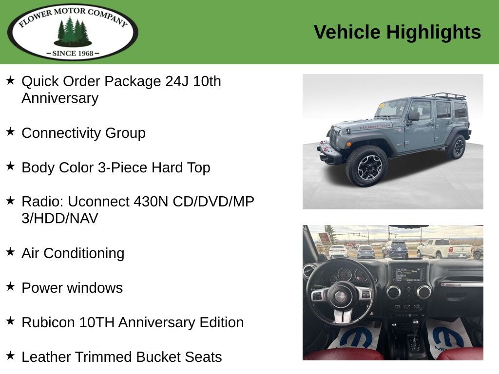 This Wrangler Unlimited Rubicon is equipped with a powerful 3.6L V6 engine and a 5-speed automatic transmission, delivering the perfect balance of performance and capability. The iconic Jeep design is enhanced with a premium black sunrider soft top, 17-inch Rubicon 10th Anniversary wheels, and a host of rugged off-road features, including Mopar rock rails, red tow hooks, and a Rubicon-specific suspension.
