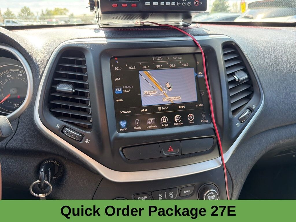 The exterior features a bold orange color scheme and a sporty black hood decal, giving the Cherokee a distinctive and eye-catching look. Inside, the premium leather-trimmed interior offers unparalleled comfort and style, with heated and ventilated front seats, a heated steering wheel, and a state-of-the-art Uconnect infotainment system with navigation.