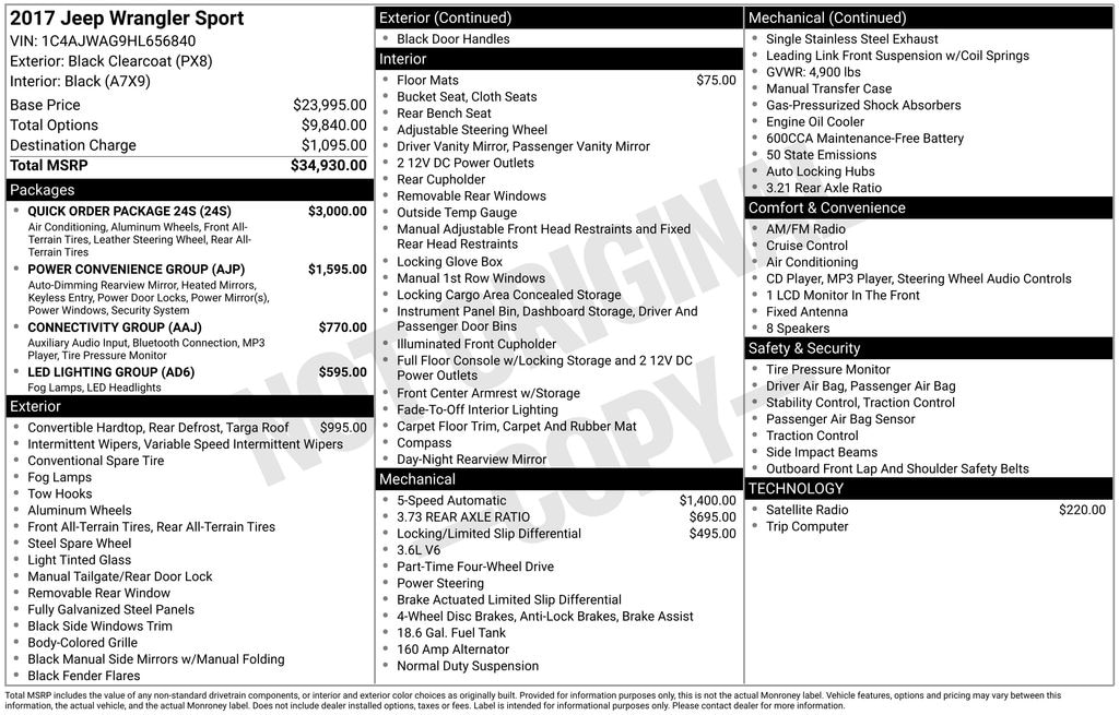 This 2017 Jeep Wrangler Sport is equipped with a robust 3.6L V6 24V VVT engine and a 5-speed automatic transmission, providing the perfect blend of power and efficiency for your adventures. Boasting a sleek black exterior, this Wrangler is ready to tackle any terrain with its 4-wheel drive capabilities.