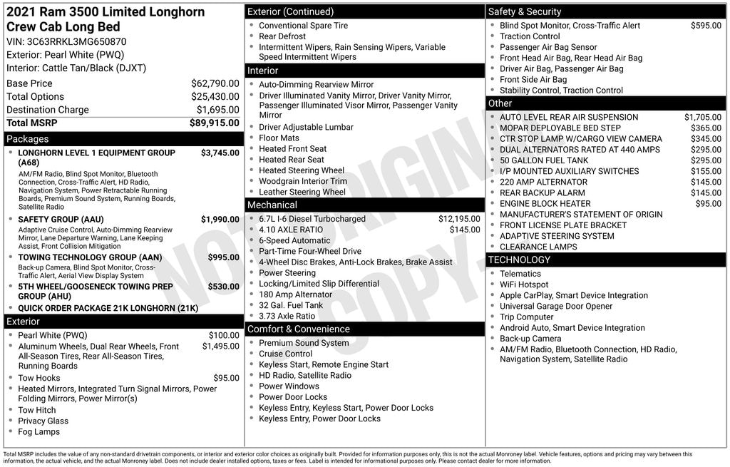 This powerful 2021 Ram 3500 Laramie Longhorn is a true workhorse, engineered to handle the toughest jobs with ease. Equipped with the legendary 6.7L I-6 Diesel Turbocharged (Cummins) (HO) engine, this truck delivers unparalleled performance and capability. The Longhorn Level 1 Equipment Group, Safety Group, and Towing Technology Group elevate this Ram 3500 to a new level of sophistication and convenience.